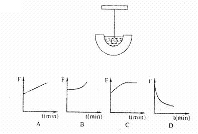52,如图所示,一悬挂的小铁球浸在用鲜南瓜制成的“容器”所盛的30%的蔗糖溶液中,开 始时线所受的拉力大于零,则能正确反映线所受拉力F在实验开始一段时间内变化情况的曲线是