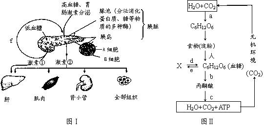 1.下面图Ⅰ表示胰岛素与胰高血糖素在调节葡萄糖代谢中的相互关系,当血糖浓度降低时,激素①分泌量增加并通过生理过程f影响②的分泌。图Ⅱ为碳在无机环境、植物、动物体内的变化情况。a、b、c、d、e表示不同的生理作用过程,X表示某物质。下列有关叙述正确的是( )
