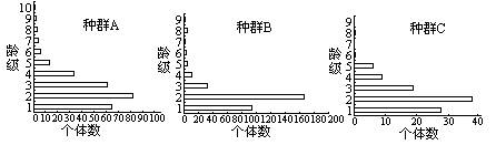3.研究人员根据黄杉胸径的大小划分了不同龄级,对种群A(自然状态)和种群B、C(不同人为干扰强度)进行了取样调查,结果如下图。由此得出的结论错误的是( )