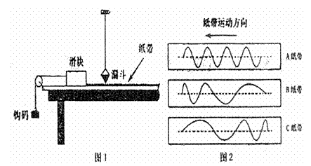 (2)(12分)某实验小组拟用如图1所示装置研究滑块的运动。实验器材有滑块、钩码、纸带、米尺、带滑轮的木板,以及由漏斗和细线组成的单摆等。实验中,滑块在钩码作用下拖动纸带做匀速加速直线运动,同时单摆垂直于纸带运动方向摆动,漏斗漏出的有色液体在纸带下留下的痕迹记录了漏斗在不同时刻的位置。