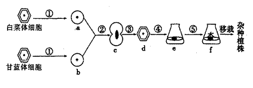 (20分)科学家用植物体细胞杂交方法,成功地培育出了“白菜--甘蓝”杂种植物,如图所示(其中①-⑤表示过程,英文字母表示细胞、组织或植株)。请据图回答下列问题:
