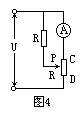 17.图4所示电路中,A、B两端电压恒定,电流表内阻可忽略不计,定值电阻与滑动变阻器的全部电阻相等,均为R,当滑动键P从变阻器的上端C一直移到下端D的过程中,电流表示数情况应是( )