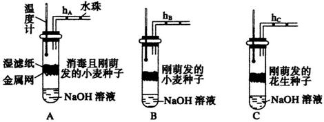 (5)在下图密闭装置中,分别放入适量干重相等的消毒且刚萌发的小麦种子、刚萌发的小麦种子及刚萌发的花生种子,把三套装置放在隔热且适宜的条件下培养,一段时间后玻璃管中水珠移动的距离为hA、hB、hC,则hA hB(填“>”、“<”或“=”);当种子中有机物消耗完后,温度计读数为TC TB(填“>”、“<”或“=”)。