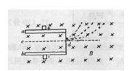如图所示,a、b是一对平行的金属板,分虽接到直流电源的两极上,右边有一挡板,正中间开有一小孔d,在较大范围内存在着匀强磁场,磁感应强度的大小为B,方向垂直纸面向里。从两板左侧中点C处射入一束正离子,这些正离子都能沿直线运动到右侧,从d孔中射出后分成三束,则这些正离子 ( )