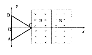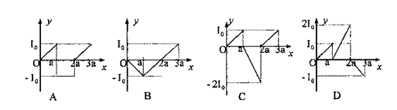 如图所示,两个垂直纸面的匀强磁场方向相反,磁感应强度的大小相均为B,磁场区域的宽度均为a,一正三角形(高度为a)导线框ABC从图示位置沿图示所示方向匀速穿过两磁场区域,以逆时针方向为电源的正方向,则图乙中感应电流I与线框移动距离x的关系图象正确的是 ( )