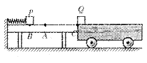(18分)在光滑水平面上,一质量为M=3.5kg的小车紧靠在桌子边缘,小车长为L=1.2m,其左端放有一可视为质点的滑块Q,其质量m2=0.5kg。桌面上水平放置的轻弹簧左端固定在墙壁上,此时弹簧处于原长,右端在A点与一可视为质点.质量为m1=1kg的小滑块P相接触(未拴接)。在弹性限度内,用向左的水平推力将P缓慢推至B处,如下图,水平推力所做的功为WF=6J,然后撤去推力,P沿桌面滑上小车并与Q相碰,P与小车相对静止时距小车左端0.5m,此时Q也与小车相对静止并恰停在小车的右端。已知AB间距为L1=5cm,AC间距为L2=90cm,P与桌面间动摩擦因数