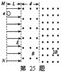 (20分)如图所示,水平方向的匀强电场的电场强度为E,场区宽度为L,竖直方向足够长. 紧挨着电场的是垂直纸面向外的两个匀强磁场区域,其磁感应强度分别为B和2B. 一个质量为m、电量为q的带正电粒子,其重力不计,从电场的边界上的a点由静止释放,经电场加速后,用时间t2=穿过中间的磁场,再进入右边的磁场后能按某一路径再返回到电场的边界MN上的某一点b,图中虚线为场区的分界面. 求:
