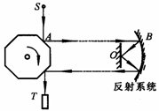 如图所示是迈克尔逊用转动八面镜法测光速的实验示意图,图中S为发光点,T是望远镜,平面镜O与凹面镜B构成了反射系统。八面镜距反射系统的距离为AB=L(L可长达几十千米),且远远大于OB以及S和T到八面镜的距离。现使八面镜转动起来,并缓慢增大其转速,当转动频率达到