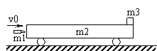 (20分)如图所示,一质量m2=0.25kg的平顶小车,车顶右端放一质量m3=0.2kg的小物体,小物体可视为质点,与车顶之间的动摩擦因数μ=0.4,小车静止在光滑的水平轨道上。现有一质量m1=0.05kg的子弹以水平速度v0=12