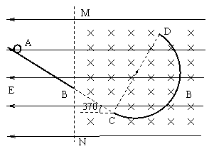(20分)如图,与水平面成37°倾斜轨道AB,其沿长线在C点与半圆轨道CD(轨道半径R=1m)相切,全部轨道为绝缘材料制成且放在竖直面内。整个空间存在水平向左的匀强电场,MN的右侧存在垂直纸面向里的匀强磁场。一个质量为0.4kg的带电小球沿斜面下滑,至B