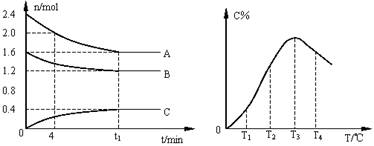 在10L密闭容器中,A、B、C三种气态物质构成可逆反应体系。某温度下,A、B、C三者物质的量与时间的关系如下左图所示,而C的百分含量与温度的关系如下右图所示。