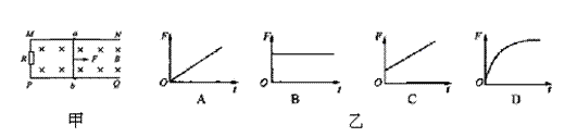 如图甲所示,平行金属导轨MN、PQ水平放置,M、P间接阻值为R的固定电阻。金属棒ab垂直于导轨放置,且始终与轨轨接触良好。导轨和金属棒的电阻不计。匀强磁场方向垂直导轨所在平面。现用垂直于ab棒的水平向右的外力F,拉动ab棒由静止开始向右做匀加速直线运动,图乙中哪一个能够正确表示外力F随时间变化的规律 ( )