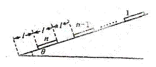 的斜面上,质量皆为m,每个货箱的长度为l,相邻两货箱间距离也是l,最下端的货箱到斜面底端的距离也是l,已知货箱与斜面之间的滑动摩擦力与最大静摩擦力相等,现给第1个货箱一初速度v0使之沿斜面下滑,在每次发生碰撞后,发生碰撞的货箱都粘合在一起运动,当动摩擦因数为μ时,最后第n个货箱恰好停在斜面底端。求: