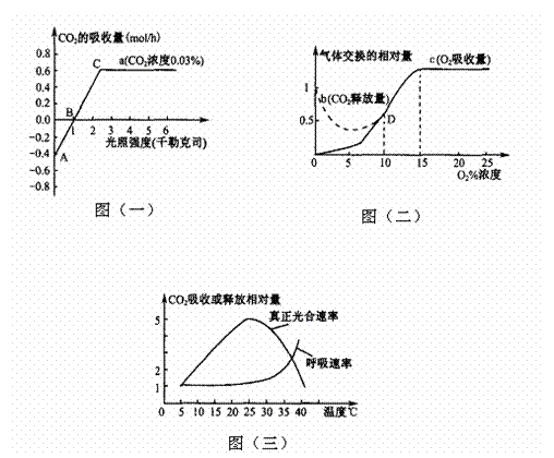 ①图(一)中光合作用强度是用CO2吸收量(mol/h)表示的,如果改为O2的吸收量(mol/h)表示,请在图(一)中绘出光合作用强度与光照强度的关系曲线;