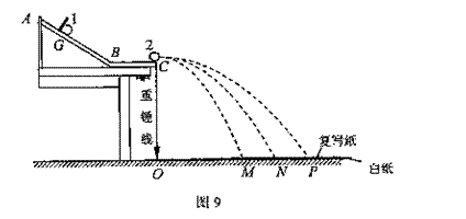 (1)(7分)某同学用如图9所示的装置,利用两个大小相同的球做对心碰撞来验证动量守恒定律,图中AB是斜槽,BC是水平槽,它们连接平滑,O点为重锤线所指的位置。实验时先不放置被碰球2,让球1从斜槽上的某一固定位置G由静止开始滚下,落到位于水平地面的记录纸上,留下痕迹,重复10次。然后将球2置于水平槽末端,让球1仍从位置G由静止滚下,和球2碰撞。碰后两球分别在记录纸上留下各自的痕迹,重复10次。实验得到小球的落点的平均位置分别为M、N、P。