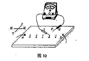 ②如图10是“用描迹法画出电场中平面上的等势线”实验示意图,电极A接电源正极,电极B接电源负极,a、b、c、d、e是五个基准点。当电流从“+”接线柱流入电流表时,指针向“+”接线柱一侧偏转;当电流从“-”接线柱流入电流表时,指针向“-”接线柱一侧偏转。在实验时,探针I接触基准点d,另一探针II接触探测点p时,发现表的指针发生了偏转,为了尽快探测到与d点等电势的点,则下列正确的是