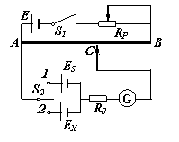 Ⅱ. (1). 如图所示为一种测量电源电动势的电路原理图. E为供电电源,ES为标准电源,EX为待测电源,RP是限流电阻,R0是电流表的保护电阻,AB是均匀电阻丝,长度为L. 闭合S1进行测量时,先将S2合到“1”位置,移动C至C1处时,恰好使电流表指针指零,测得AC1=