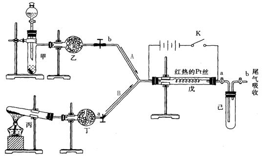 ⑸当已中充满红棕色气体后,停止给丙加热,并关闭a,b活塞。取下已装置并浸入冰水中,则已中会出现的现象是 ,简述产生此现象的原因 。