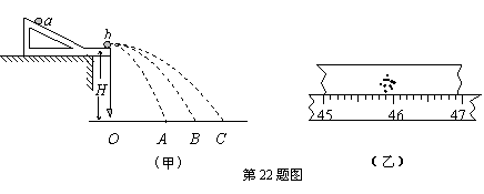 22.(Ⅰ)(9分)某同学用如图(甲)装置做《探究碰撞中的不变量》实验。先将a球从斜槽轨道上某固定点处由静止开始滚下,在水平地面上的记录纸上留下压痕,重复10次;再把同样大小的b球放在斜槽轨道末端水平段的最右端附近静止,让a球仍从原固定点由静止开始滚下和b球相碰后,两球分别落在记录纸的不同位置处,重复10次。已知小球a的质量大于小球b的质量。