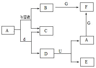 26.(14分)五种短周期元素X、Y、Z、U、W的原子序数依次增大。已知强碱a由X、Y、Z三种元素组成;气体b由X、W两种元素组成,其水溶液显强酸性;物质d由X、Y两种元素组成,且常温常压下为无色液体;元素U对应的金属单质既能与a溶液反应,又能与b溶液反应;在F溶液中滴加a溶液会产生红褐色沉淀。以下框图中,A为常见金属单质,C、G为常见非金属单质;B、D、E、F均为化合物,且化合物E仅由Y、U两种元素组成,D与U单质反应时,其物质的量之比为3︰8。