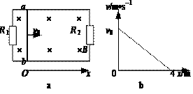 25.(22分)如图甲所示,质量为m=0.5 kg、电阻为r=1Ω的跨接杆ab可以无摩擦地沿水平固定导轨滑行,导轨足够长,两导轨间宽度为L=1 m,导轨电阻不计,电阻R1=1.5Ω ,R2=3 Ω,装置处在竖直向下的匀强磁场中,磁感应强度为B=1 T。杆从x轴原点O以水平初速度向右滑行,直到停止。已知杆在整个运动过程中速度v随位移x变化的关系如图乙所示。求: