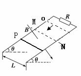 (22分)如图所示,两根平行金属导轨放置在倾角为θ的绝缘斜面上,两导轨间距L,仅在虚线MN下面的空间存在着磁感应强度随高度变化的磁场(在同一水平线上各处磁感应强度相同),磁场方向垂直斜面向下,导轨上端跨接一定值电阻R。质量为m的金属棒两端各套在导轨上并可在导轨上无摩擦滑动,金属棒始终与导轨垂直,导轨和金属棒的电阻不计,现将金属棒从O处由静止释放,进入磁场后正好做匀减速运动,刚进入磁场时速度为v,到达P处时速度为0.5v,O点和P点到MN的距离相等,求: