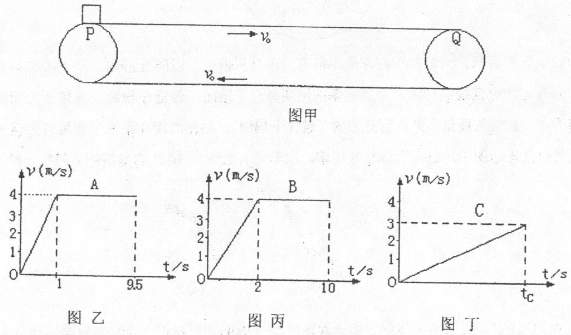 24(20分)、如图甲所示,水平传送带顺时针方向匀速运动。从传送带左端P先后由静止轻轻放上三个物体A、B、C,物体A经
