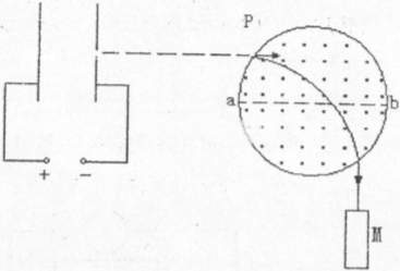 的距离为0.6R,粒子从磁场中射出时方向变为竖直向下,然后进入收集器M,求加速由场的电压。