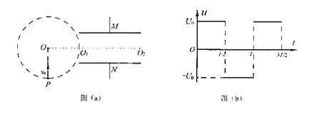 如图(a)所示,在真空中,半径为b的虚线所围的圆形区域内存在匀强磁场,磁场方向与纸面垂直。在磁场右侧有一对平行金属板M和N,两板间距也为b,板长为2b,两板的中心线O1O2与磁场区域的圆心O在同一直线上,O1也是圆周上的一点,两板左端与O1在同一竖直线上。有一电荷为+q、质量为m的带电粒子,以速率v0从圆周上的P点沿垂直于半径OO1并指向圆心O的方向进入磁场,当从O1点飞出磁场时,给M、N板加上如图(b)所示电压u,电后粒子刚好以平行于N板的速度,从N板的边缘飞出。不计平行金属板两端的边缘效应及粒子所受的重力。