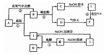A-J分别表示中学化学中常见的一种物质,它们之间相互关系如下图所示(部分反应物、生成物没有列出),且已知G为主族元素的固态氧化物,A、B、C、D、E、F六种物质中均含同一种元素。请填写下列空白: