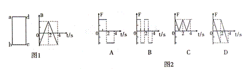 20.矩形导线框abcd放在匀强磁场中,在外力控制下静止不动,磁感线方向与线圈平面垂直,磁感应强度B随时间变化的图像如下图1所示,t=0时刻,磁感应强度的方向垂直纸面向里,在0~4s时间内,线框ab边受力随时间变化的图像(力的方向规定以向左为正方向)可能是下图2中的 ( )