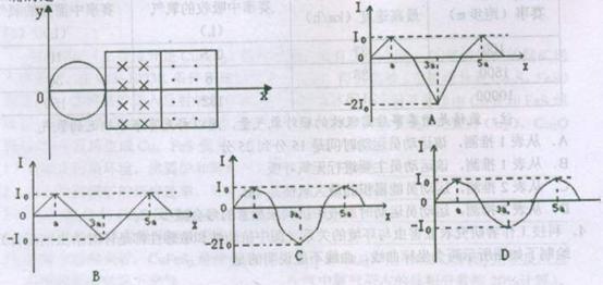 17.如图所示,两个垂直纸面的匀强磁场方向相反.磁感应强度的人小均为B.磁场区域的宽度均为2a,一个直径为2a的导线圆环从图示位置沿x轴止方向匀速穿过两磁场区域,以逆时针方向为电流的正方向,则感应电流l与导线圆环移动距离x的关系图像正像确的是