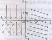 (纸面)向里的匀强磁场。在第一、第四象限,存在着与x轴正方向夹角为30°的匀强电