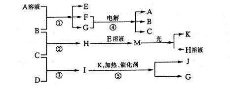 (1)写出下列物质的化学式:B: J: (2) 写出反应④的离子方程式: