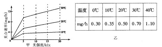 Ⅱ.(10分)将金鱼藻置于一烧杯中培养,甲图表示不同温度下,金鱼藻光合速率(用每小时O2释放量表示)与光照强度的关系。乙表表示呼吸速率(用每小时O2消耗量表示)与温度的关系。据图回答: