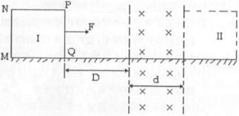 ,开始时放在光滑绝缘水平板上“I”位置,现用一水平向右的恒力F=0.8N拉线框,使其向右穿过磁场区,最后到达“II’’位置(MN边恰好出磁场)。设线框平面在运动中始终保持在竖直平面内,PQ边刚进入磁场后线框恰好做匀速运动。试求: