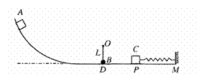 24.(18 分)如图所示的轨道由位于竖直平面的圆弧轨道和水平轨道两部分相连而成. 水平轨道的右侧有一质量为2m 的滑块C 与轻质弹簧的一端相连,弹簧的另一端固定在竖直的墙M上,弹簧处于原长时,滑块C 在P 点处;在水平轨道上方O 处,用长为L 的细线悬挂一质量为m 的小球B,B 球恰好与水平轨道相切于D 点,并可绕D 点在竖直平面内摆动。