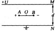 24.(18分)如图所示,水平放置的平行金属板的N板接地,M板电势为+U,两板间距离为d,d比两板的尺寸小很多,在两板之间有一长为2l的绝缘轻杆,可绕杆的水平固定轴O在竖直面内无摩擦地转动,O为杆的中点。杆的两端分别连着小球A和B,它们的质量分别为2m和m,它们的带电量分别为+q和-q。当杆由图示水平位置从静止开始转过900到竖直位置时,