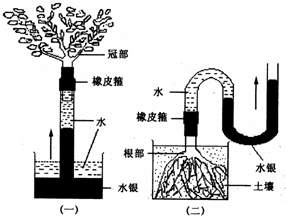 I.(12分)将一盆栽植物从茎基部剪为冠部和根部两段。将其冠部插入充满水的玻璃管中,玻璃管的另一端插入盛有水银的容器中。不久,水银柱上升,如图(一)所示;在其根部上端则套上一个弯曲的玻璃管,管内装有水和水银。不久,玻璃管内水分增加,水银柱上升,如图(二)所示。
