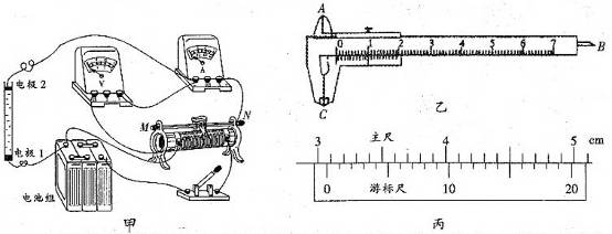 实验中的测量情况如下;安装前他用图乙所示的游标卡尺测量玻璃管的内径,结果如图丙所示。测得两电极相距
