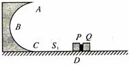 (18分)如图所示,ABC是竖直固定的半圆形光滑圆弧槽,底端与水平地面相切于C点,半径R=0.1m.P、Q是两个可视为质点的物体,