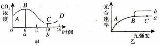 (1)甲图中,一昼夜中CO2浓度最高和最低的时间点分别是a时和b时,在这两个时点,植物光合作用强度 (大于、等于、小于)呼吸作用强度。