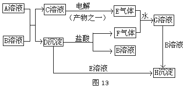 28.(15分)下图13是中学化学中常见的物质间转化关系图,其中A的焰色反应呈黄色,E、F为有刺激性气味的气体,G溶液为强酸性溶液,H为既难溶于水,也难溶于稀酸的白色沉淀。