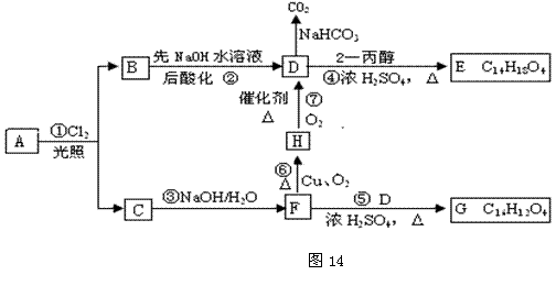 (15分)某烃A蒸气密度是相同状况下氢气密度的53倍,10.6g A在O2 中燃烧生成CO、CO2和9g H2O 。已知烃A不能使溴的四氯化碳溶液褪色,但能使KMnO4酸性溶液褪色,且该烃苯环上的一氯取代物只有一种结构。已知有机物中同一个碳原子上连有两个羟基时会脱水形成羰基,A可以发生Y如图14的一系列变化: