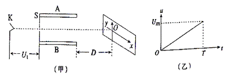 19.示波器是一种多功能电学仪器,可以在荧光屏上显示出被检测的电压波形。它的工作原理等效成下列情况:(如图甲所示)真空室中电极K发出电子(初速不计),经过电压为U1的加速电场后,由小孔S沿水平金属板A、B间的中心线射入板中。在两极板右侧且与极板右端相距D处有一个与两板中心线垂直的范围很大的荧光屏,中心线正好与屏上坐标原点相交,电子通过极板打到荧光屏上将出现亮点,若在A、B两板间加上如图乙所示的变化电压,则荧光屏上的亮点运动规律是