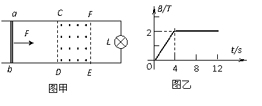 的小灯泡L。在CDEF矩形区域内有竖直向上的匀强磁场,磁感应强度B随时间t变化如图乙所示,CF长为2m。在