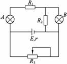 如图所示的电路中,灯泡A和灯泡B原来都是正常发光的。现在突然灯泡A比原来变暗了些,灯泡B比原来变亮了些,则电路中出现的故障可能是