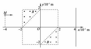 开始经加速电压为U=1 205 V的电场(图中未画出)加速后,从坐标点M(-4,2)处平行于x轴向右运动,并先后通过匀强磁场区域。