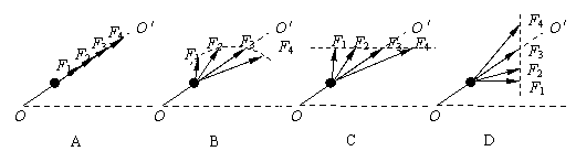 如图所示,小车上固定着三角硬杆,杆的端点处固定着一个质量为m的小球。当小车有水平向右的加速度且逐渐增大时,杆对小球的作用力的变化(用F1至F4变化表示)可能是下图中的(OO'沿杆方向)