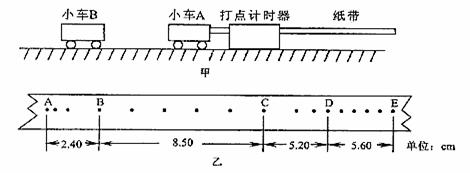 在实验得到的纸带上选取五个计数点分别为A.B.C.D.E,测得AB.BC.CD.DE的长度如图所示。已知打点计时器所用电源频率为50Hz,小车A的质量为0.400kg,小车B的质量为0.200kg,则碰前小车A的速度可利用纸带